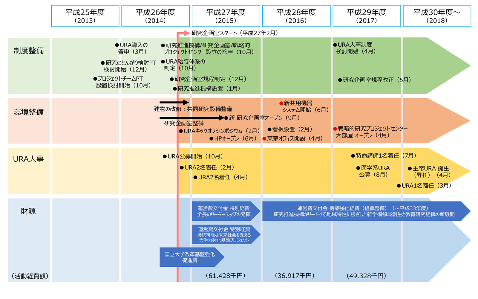 | 2017年 4月 | 新たなURA人事制度および研究企画室規程改正案の検討を開始した。 |